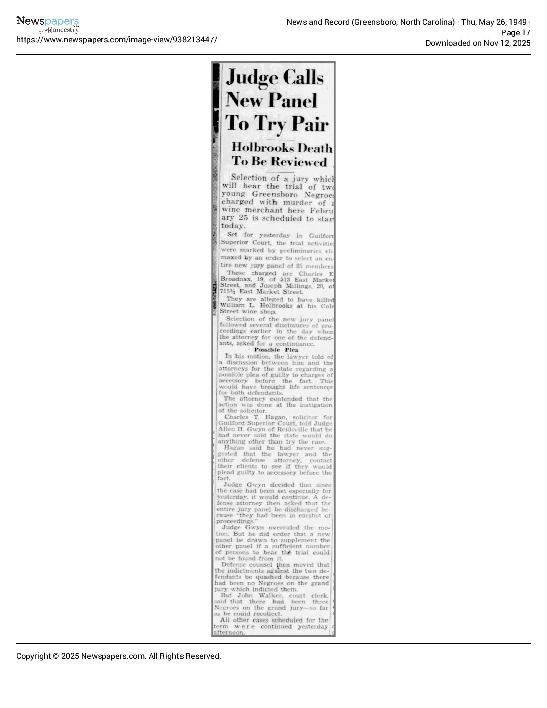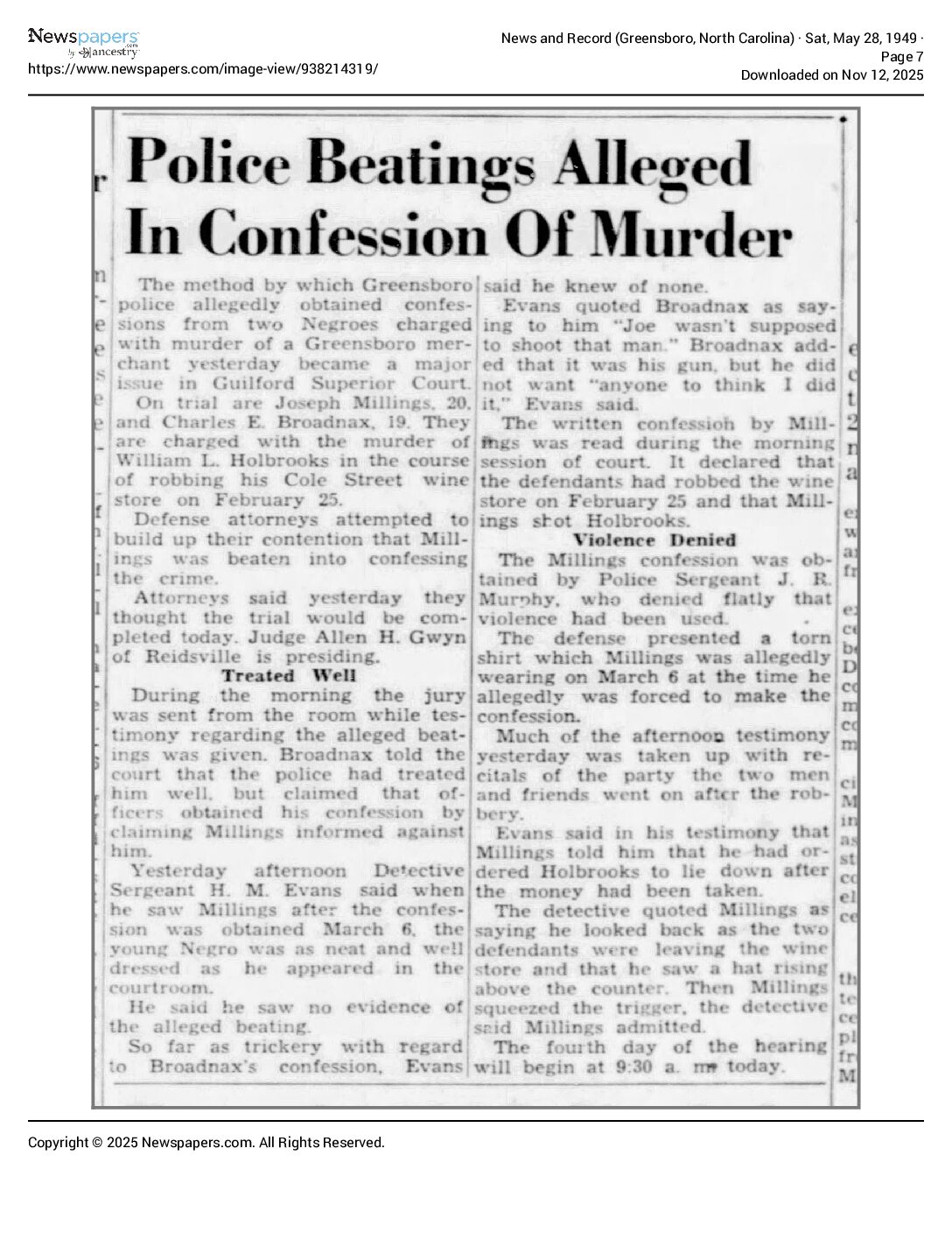 My maternal grandfather was murdered on February 25th, 1949. He owned a package store in Greensboro, NC. He was robbed of $38 and then gunned down.